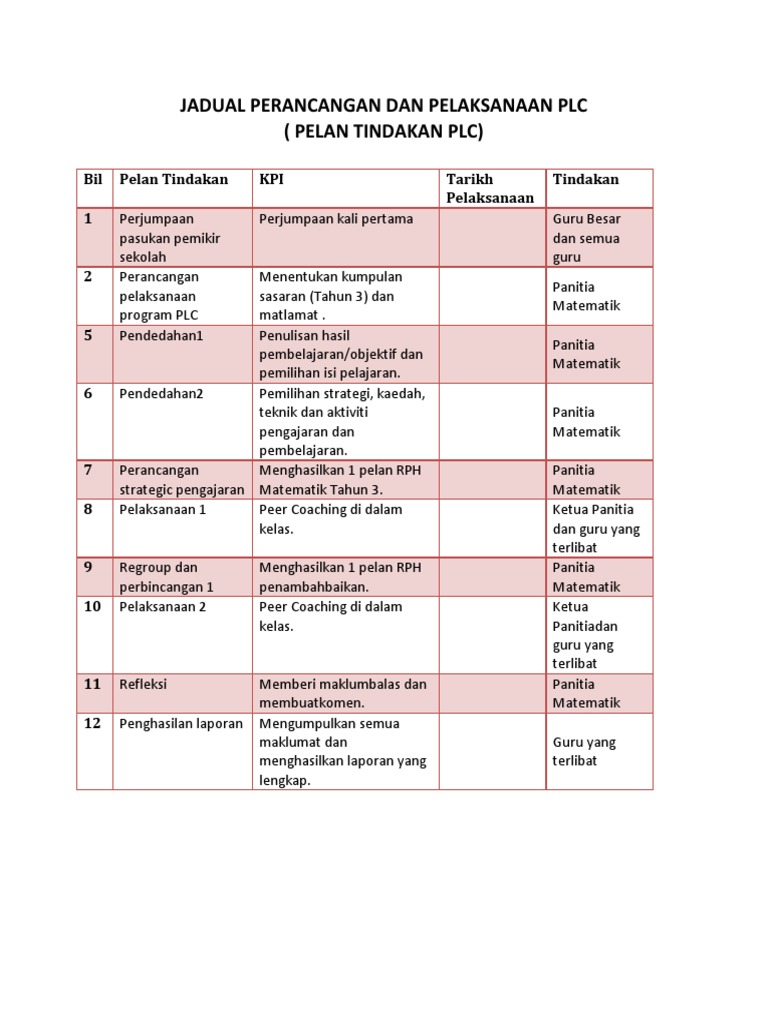 Jadual perancangan pelaksanaan plc di sekolah 2015 bil pelan tindakan kpi tarikh pelaksanaan tanggungjawab pelaksanaan penggal 1.