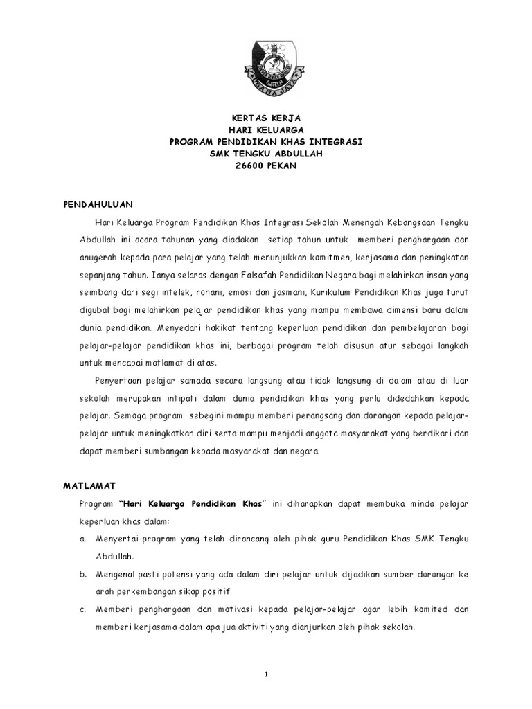 Kertas Kerja Hari Keluarga Program Pendidikan Khas Integrasi Smk Tengku Abdullah 26600 Pekan