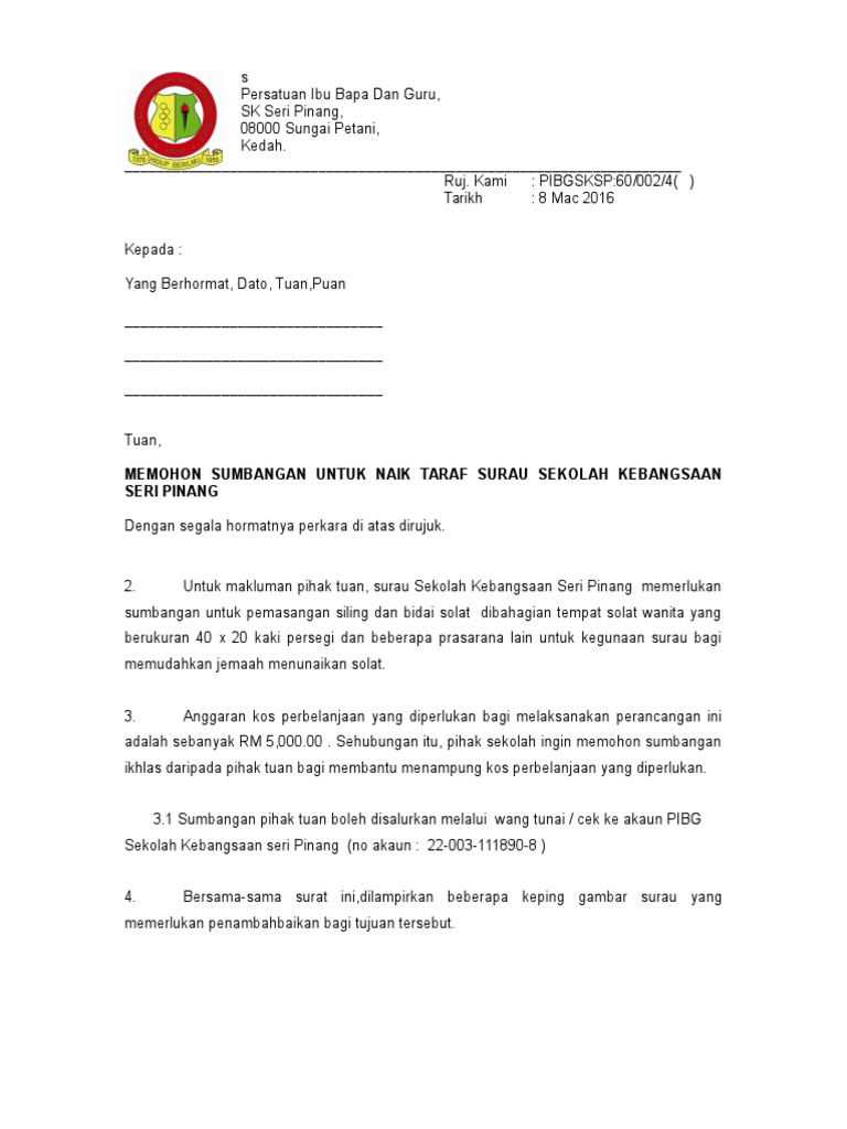 Surat Memohon Sumbangan Naik Taraf Surau